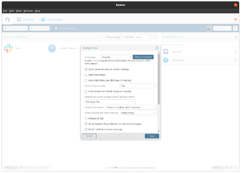 Rambox 是一个多合一消息收发工具,允许你将多种服务(如 Discord、Slack、Facebook Messenger)和数百个此类服务结合在一起。