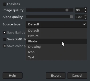 当然,也可以用开源图片编辑工具 GIMP 把图片导出为 WebP。它提供了几个质量和压缩的参数: