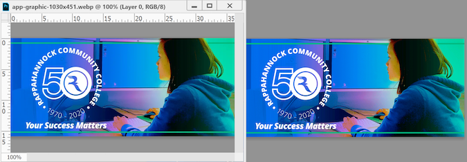 我测试的页面返回了三张图片。在它生成的报告中,它提供了推荐和目标。我选择了它报告有 650 KB 的 app-graphic 图片。通过把它转换为 WebP 格式,预计可以把图片大小降到 61 KB,节省 589 KB。我在 Photoshop 中把它转换了,用默认的 WebP 设置参数保存它,它的文件大小为 44.9 KB。比预期的还要好!从下面的 Photoshop 截图中可以看出,两张图在视觉质量上完全一样。