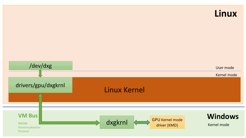 /dev/dxg设备提供给用户模式的 Linux。/dev/dxg提供了一组 IOCTL,它们与 Winodws 上的原生 WDDM D3DKMT 内核服务层非常相似。Linux 内核中的 dxgkrnl 通过 VM 总线连接到 Windows 主机上,并使用此 VM 总线连接与物理 GPU 进行通讯。