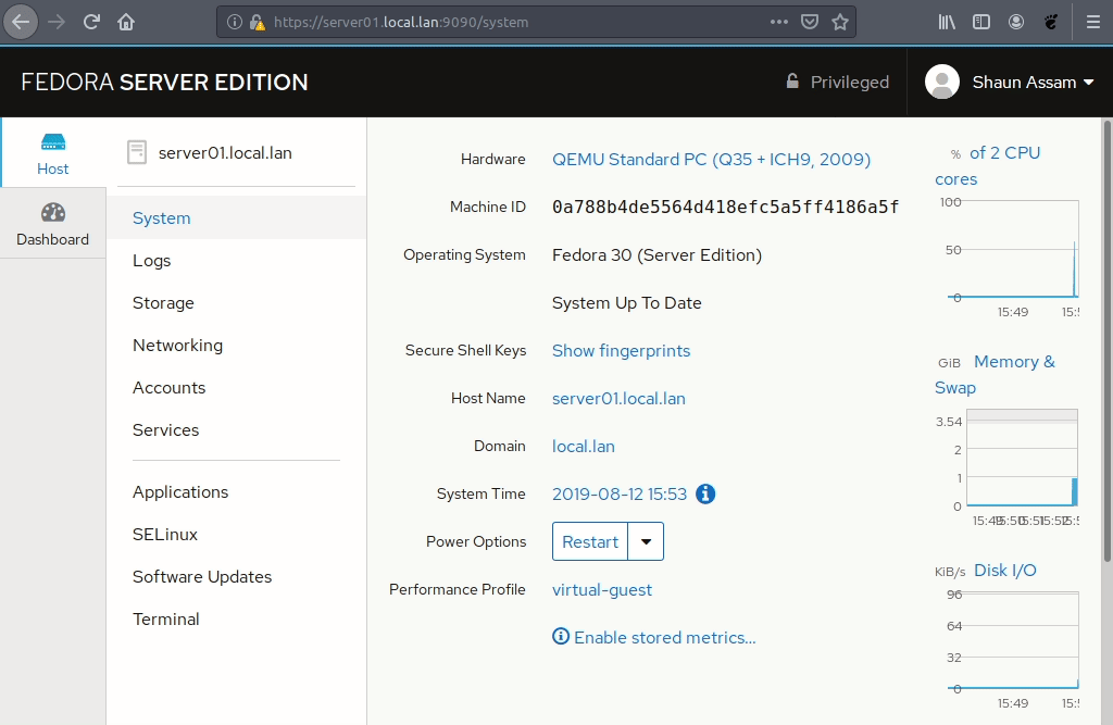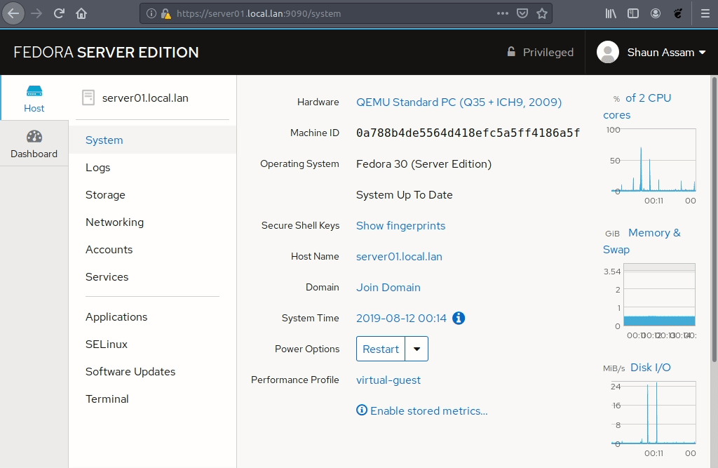 “Headless Management” 组包括了仪表盘模块(cockpit-dashboard)。它以实时图表的形式提供了 CPU、内存、网络和磁盘性能的概览。远程服务器也可以通过同一界面进行添加和管理。