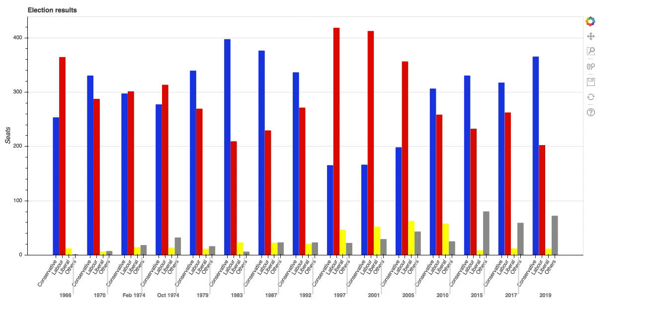 Bokeh 中的绘图比其它一些绘图库要复杂一些,但付出的额外努力是有回报的。Bokeh 的设计既允许你在 Web 上创建自己的交互式绘图,又能让你详细控制交互性如何工作。我将通过给我在这个系列中一直使用的多条形图添加工具提示来展示这一点。它绘制了 1966 年到 2020 年之间英国选举结果的数据。