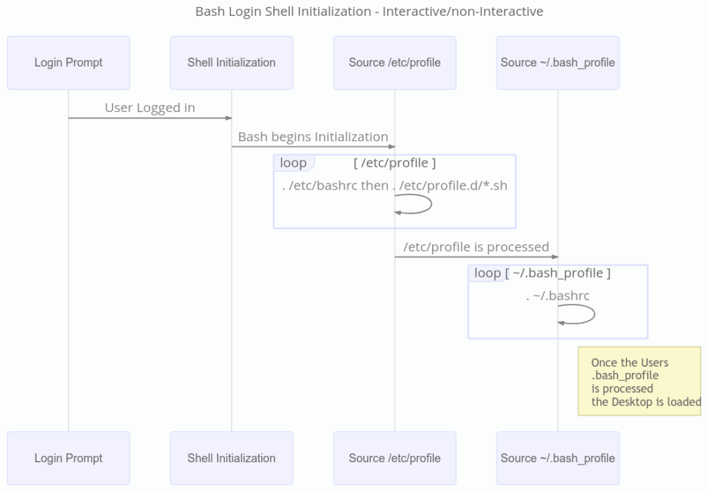 除非传入 -noprofile 选项,否则登录模式的 Bash shell 会默认读取并执行某些初始化文件中命令。如果 /etc/profile 存在,它会是第一个被执行的文件,紧接着是按 ~/.bash_profile、~/.bash_login 或 ~/.profile顺序找到的第一个文件。当用户退出登录模式的 shell 时,或者有脚本在非交互式登录模式的 shell 中调用了内置 exit命令,Bash 会读取并执行 ~/.bash_logout 中的命令,如果 /etc/bash_logout 存在的话,会紧接着执行它。通常来说,/etc/profile 会 援引 source /etc/bashrc 文件,读取并执行其中的命令,然后查找并读取执行 /etc/profile.d 目录中以 .sh 结尾的文件。同样的,~/.bash_profile 通常也会 援引 source ~/.bashrc 文件。/etc/bashrc 和 ~/.bashrc 都会进行检查,避免重复 援引 source 。