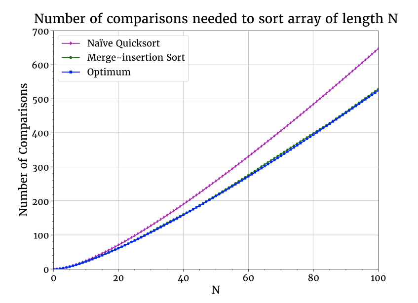 以上都是理论说法,那么实际的排序算法如何做比较的呢?下面是一个数组排序所需比较次数均值的图。我比较的是理论值与快速排序及 Ford-Johnson 合并插入排序 的表现。后者设计目的就是最小化比较次数(整体上没比快速排序快多少,因为生活中相对于最大限度减少比较次数,还有更重要的事情)。又因为 合并插入排序 merge-insertion sort 是在 1959 年提出的,它一直在调整,以减少了一些比较次数,但图示说明,它基本上达到了最优状态。