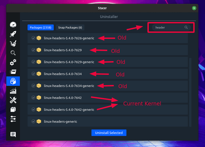 你可以使用 Synaptic 软件包管理器 或一个类似 Stacer 的工具来开始。就我个人而言,当我遇到一个满满的 /boot 分区且 APT 损坏时,我使用 Stacer 来丢弃旧内核。因此,让我向你展示一下它看起的样子。