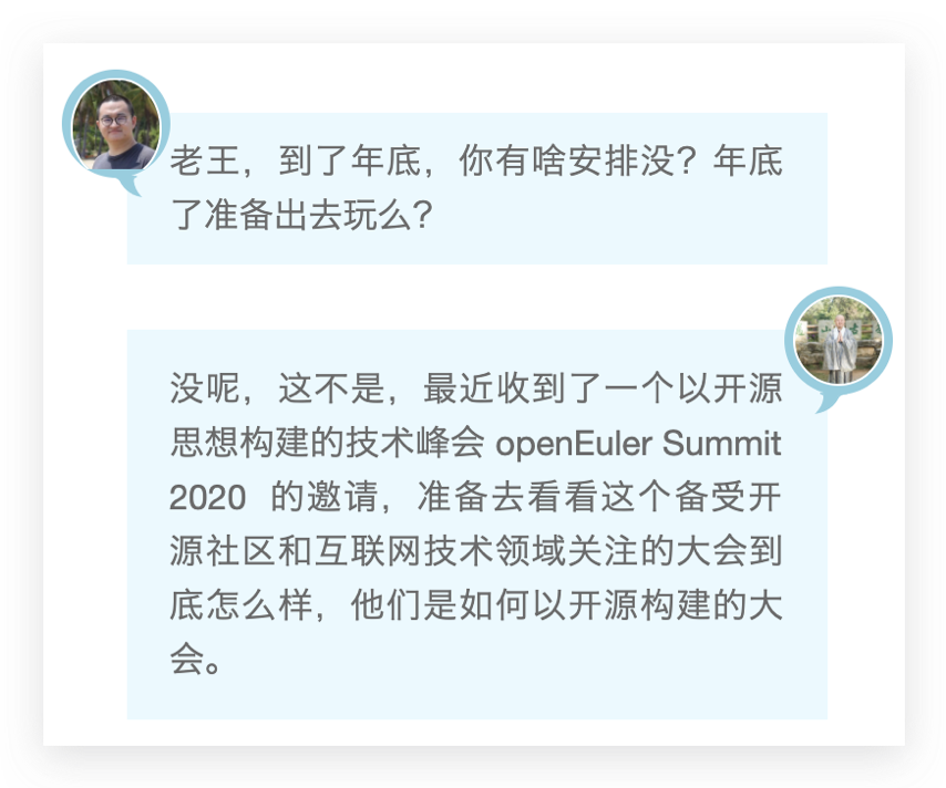 老王:没呢,这不是,最近收到了一个以开源思想构建的技术峰会 openEuler Summit 2020 的邀请,准备去看看这个备受开源社区和互联网技术领域关注的大会到底怎么样,他们是如何以开源构建的大会。