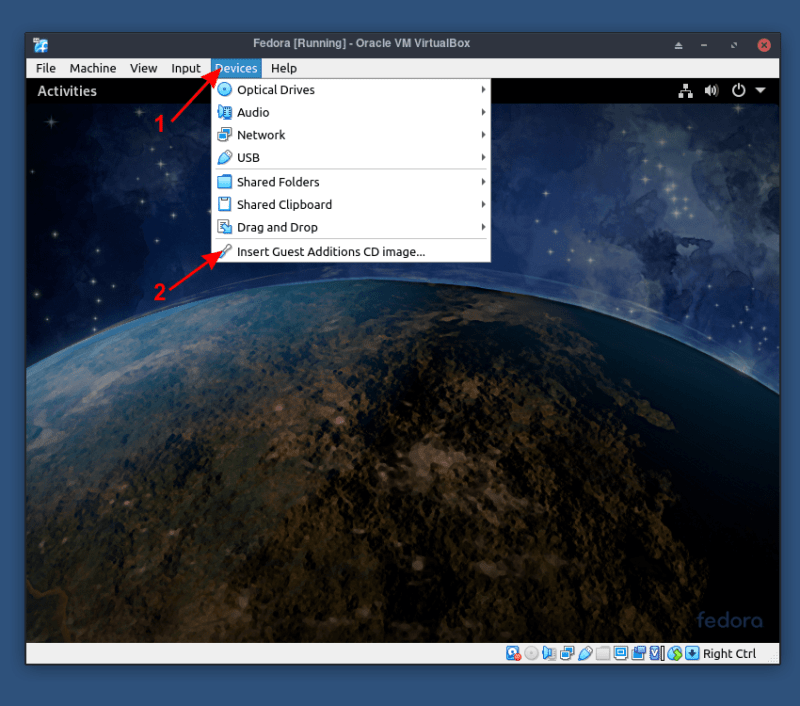 这是一个简单的过程。只需单击设备选项卡,然后单击 “Insert Guest Additions CD image”。