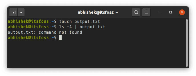 你可能对管道重定向很熟悉,可以使用它来组合 Linux 命令,但不能将输出通过管道传输到文件,它显示找不到 output.txt 命令: