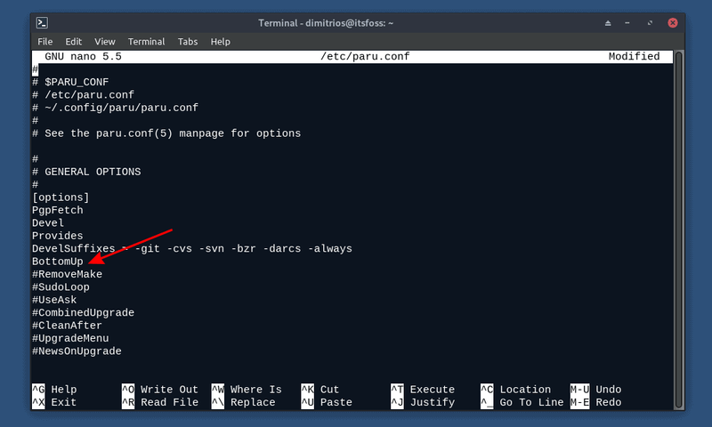要在 paru 中启用颜色,你必须先在 pacman 中启用它。所有的配置文件都在 /etc 目录下。在此例中,我使用 Nano 文本编辑器,但是,你可以选择使用任何基于终端的文本编辑器。