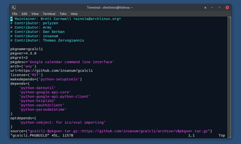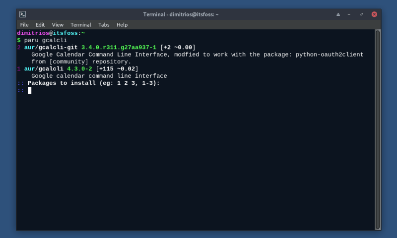 让我们回到 Google Calendar 的 AUR 包,并尝试安装它。系统会提示你审查该软件包。输入 Y 并按下回车。