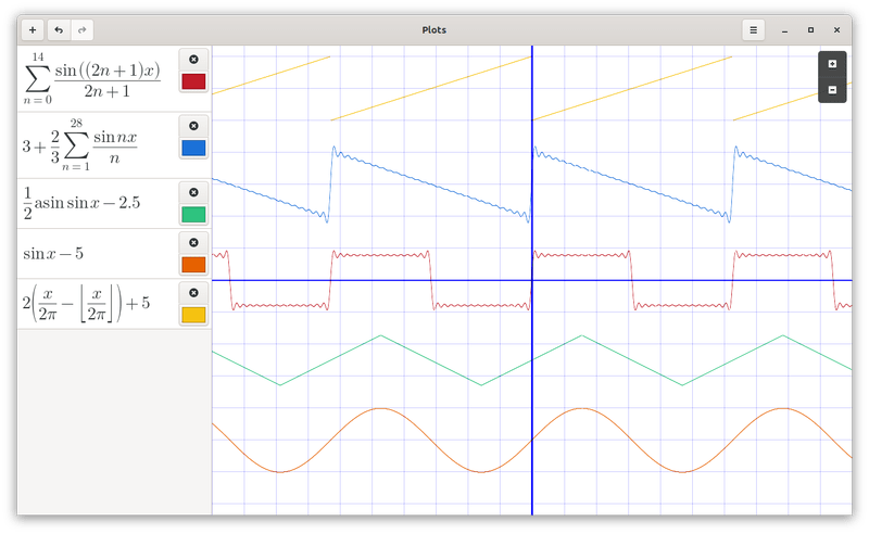 Plots 是一款图形绘图应用,它可以轻松实现数学公式的可视化。你可以用它来绘制任意三角函数、双曲函数、指数函数和对数函数的和与积。