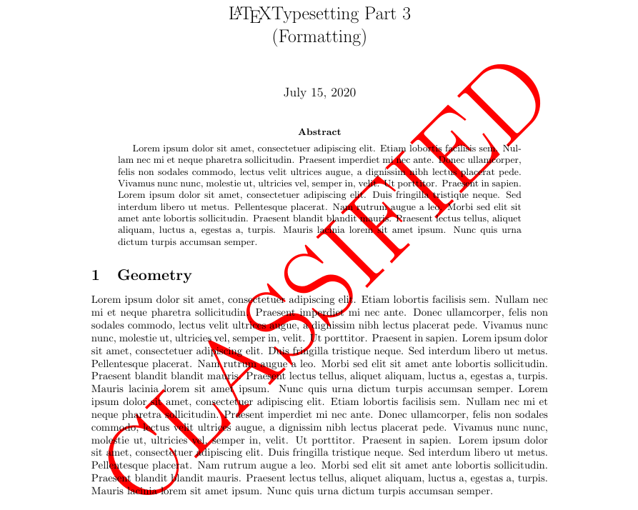 要在 LaTeX 文档中启用水印,请使用 draftwatermark 软件包。下面的代码段和图像演示了如何在文档中添加水印。默认情况下,水印颜色为灰色,可以将其修改为所需的颜色。