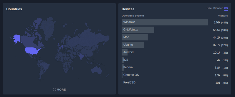 你还可以选择启用 GeoIP 来了解网站访问者的地理位置。你还可以检查有多少访问者使用桌面或移动设备访问你的网站。还有一个操作系统的选项,正如你所看到的,Linux Handbook 有 48% 的访问者来自 Windows 设备。很奇怪,对吧?