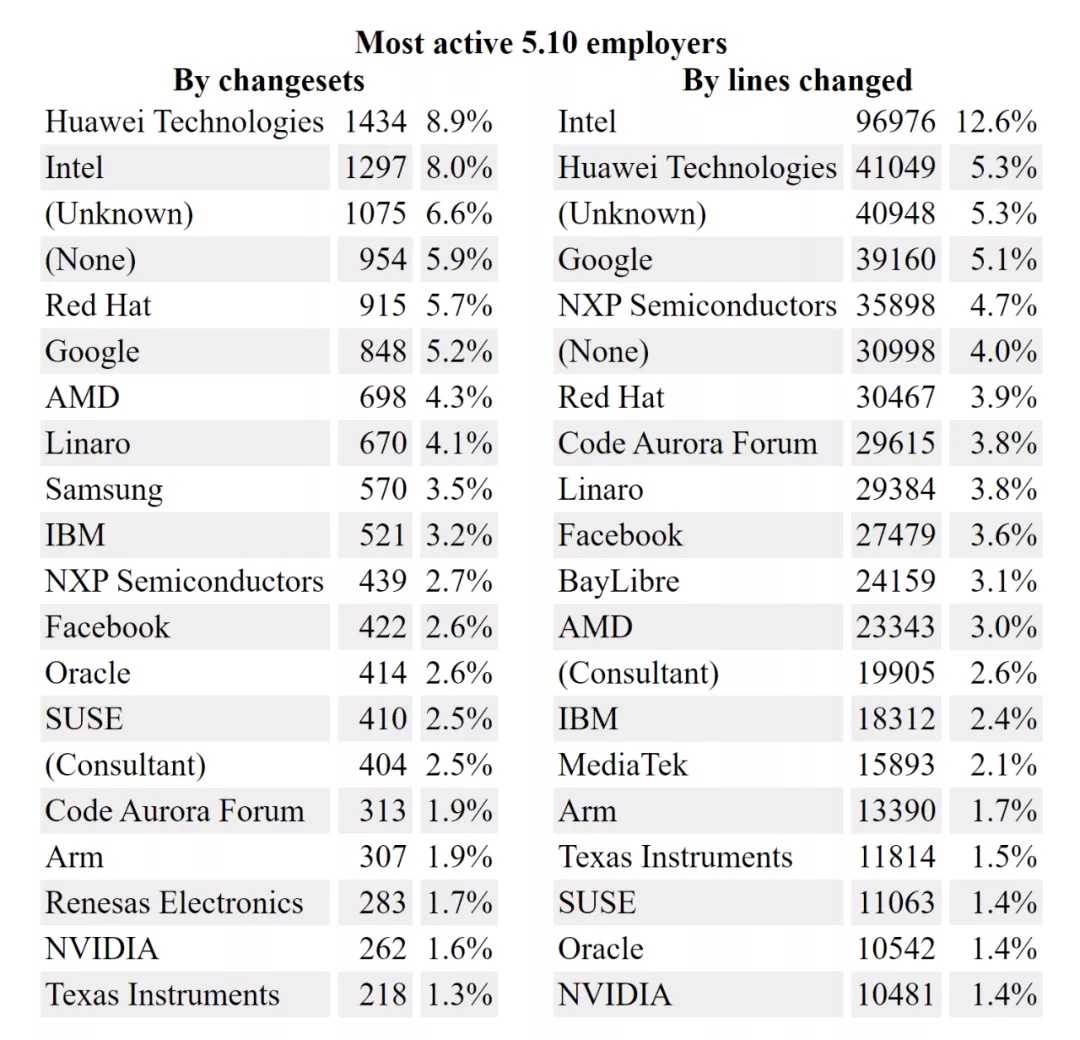 说实话,听到这个消息时,既有些意外也不意外。意外的是,我没想到中国开发者和 IT 企业已经在承担这样的重任了;不意外的是,毕竟华为已经是全球首屈一指的 Linux 内核贡献大厂了,就在 Linux 5.10 中,华为以提交 1434 个补丁而位列内核代码贡献第一名,同时以代码修改行数 41049 行位列第二名。