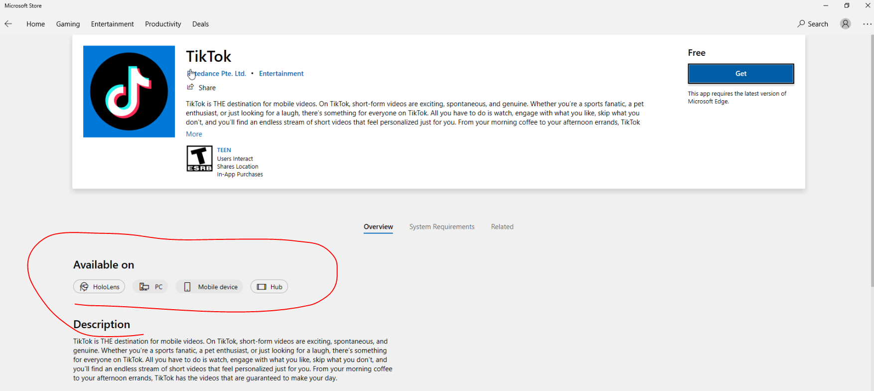 我们来安装个 tiktok 试试,看看效果如何。首先在商店中搜索“tiktok”。然后会发现,tiktok 有 PC 版、Moblie device 版本。