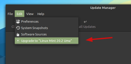 接下来,确保你做了备份(如果你想的话,可以使用 timeshift 工具),然后从编辑菜单种静茹更新管理器的系统升级选项,如下所示。