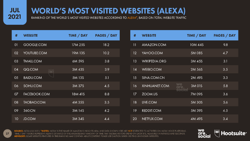 最新的 Data Reportal 的 7 月研究表明,据 Alexa 的数据,Google 成为全球访问量最大的网站,平均全球每个人每天都将花费 17 分钟访问 Google 网站。在全球网站访问量的排行榜中,国内共有 7 个网站闯入了前十名:天猫、QQ、百度、搜狐、淘宝、360 和京东。而 Amazon 位列 11 名,比国内这几家电商网站访问量要低。有一点需要注意的是,中国的网站的几乎所有流量都来自国内。这一数据清楚地表明了中国联网人口的增长速度有多快。