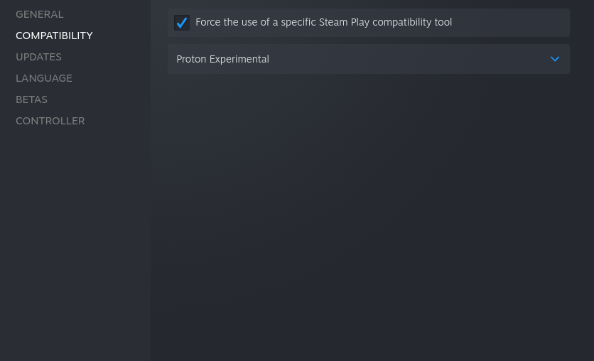 这可以通过右键点击游戏并选择“ 属性 Properties ”来完成。然后在“ 兼容性 Compatibility ”下,你需要勾选“ 强制使用特定的 Steam Play 兼容工具 Force the use of a specific Steam Play compatibility tool ”复选框。接下来,从下拉菜单中选择 “Proton Experimental”。