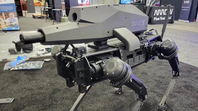 四足机器狗是近年来机器人技术中最有趣的发展之一。它们体积小,动作灵活,能够穿越那些令轮式机器沮丧的环境。在 一篇报道的图片中 显示了一个四足机器人配备了一把无人步枪。这把枪被设计成可以安装在各种机器人平台上,有 30 倍的光学变焦,热像仪可在黑暗中瞄准目标,有效射程为 1200 米。开发这把枪的公司称,“SWORD 防御系统 SPUR 是无人驾驶武器系统的未来,而这个未来就是现在。”