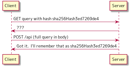 另一种方式是 Apollo GraphQL 所宣称的 自动持久查询(APQ)。对于 APQ 而言,查询 ID 是查询的哈希值。客户端向服务器发出请求,通过哈希查询。如果服务器无法识别该查询,则客户端会在 POST 请求中发送完整的查询,服务器会保存此次查询的散列值,以便下次识别。
