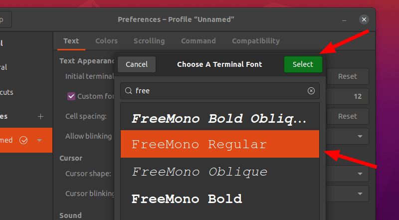 Free mono 和 Noto mono 是默认字体选择列表中可用的一些好字体,可应用于你的终端。