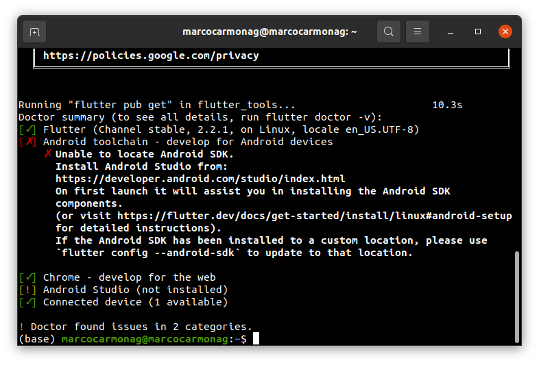 一旦安装完成,就是验证它的时候了。不仅仅是 Flutter 的安装,还要验证 Flutter 正常运行所需满足的每一个依赖关系。