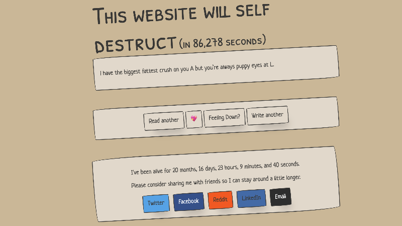2020 年 4 月,一个名为“这个网站会自毁”的网站悄悄上线了。它的自毁可以被网友们拯救:“你可以向我发送信息。如果 24 小时内我没有收到信息,将会永久自毁。”不过快两年过去了,它依然活着。这个网站上有各种各样的留言,你留言之后不但可以给这个网站续命,而且可以随机看到一条别人的留言。