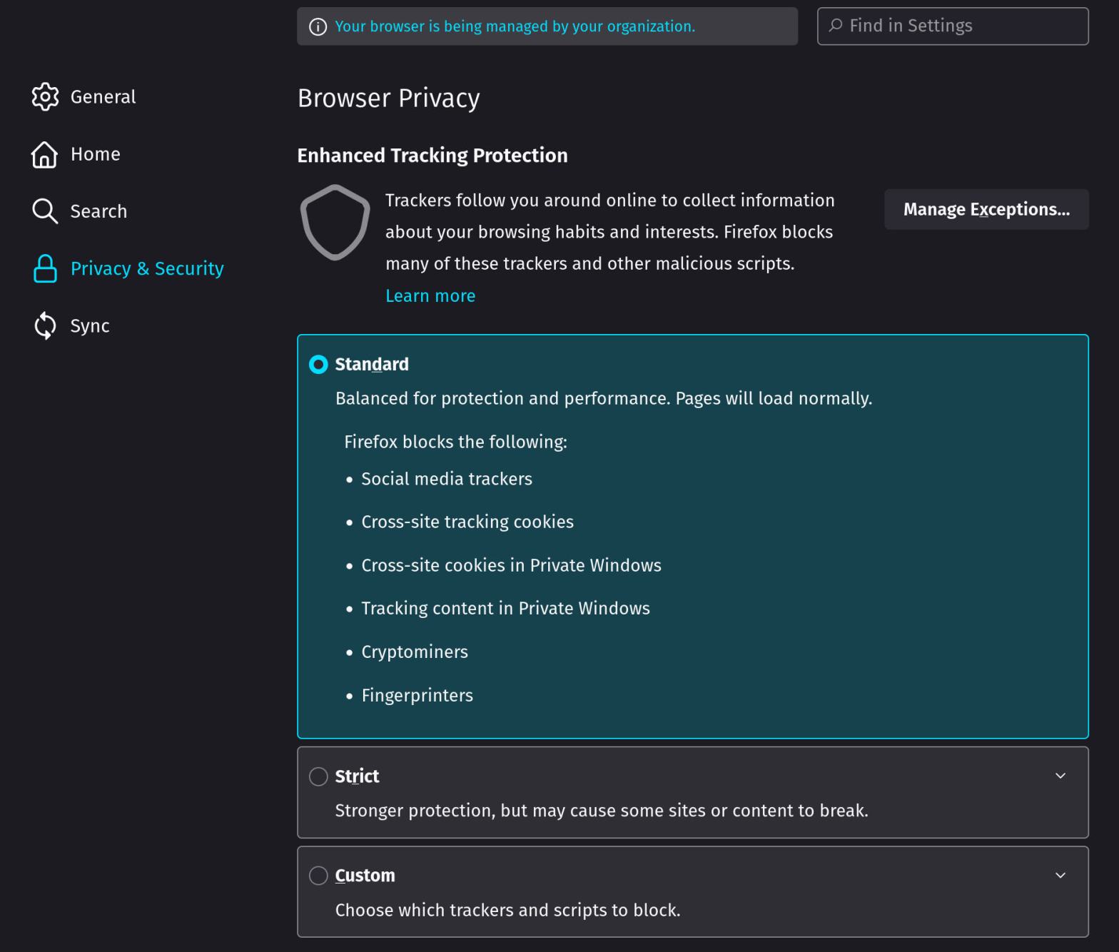 Brave 可以让你自定义跟踪保护,但它不提供预设配置。你得自己调整拦截保护措施以获得你想要的体验。但是,火狐浏览器可以让你轻松地选择“标准”或“严格”保护模式,而不需要定制个人设置。