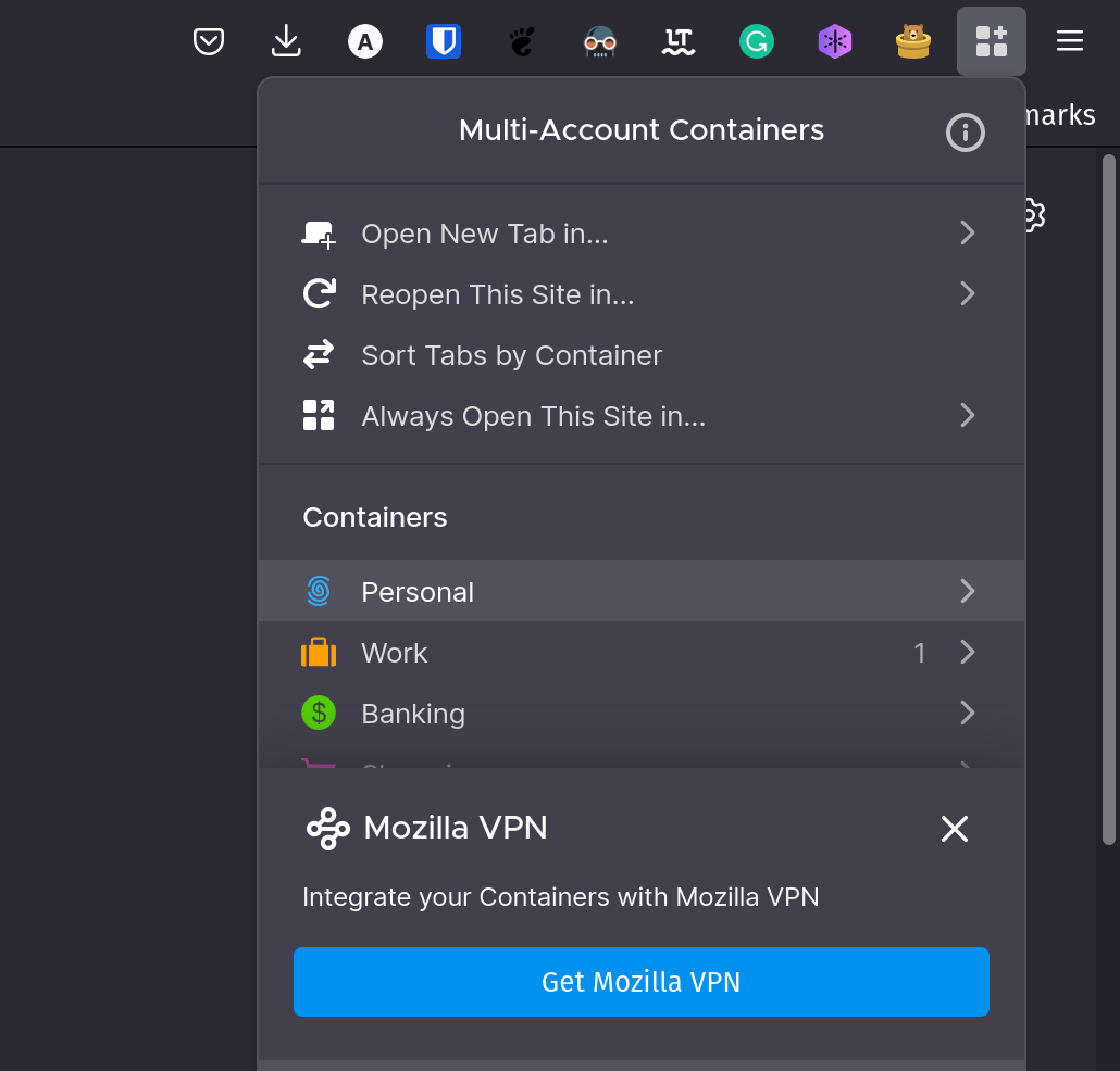 为了更上一层楼,火狐最近增加了为容器启用 Mozilla VPN 的功能。这样,你就可以单独保障你的浏览过程,而不需要为其余的非容器标签启用 VPN。