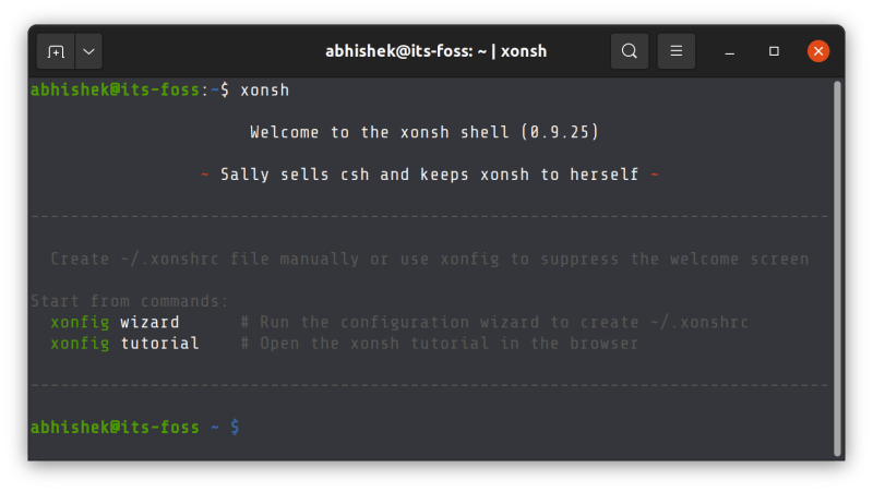 它会建议你运行一个设置向导,然后创建一个 Xonsh shell 的自定义 rc 配置文件。这是可选的,你也可以晚些时候再做。