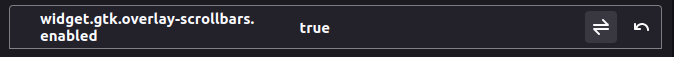 但在稳定版中这个特性默认没有启用。开启这个特性,转到 about:config,搜索 widget.gtk.overlay-scrollbars.enabled。这个值默认是 false,双击它将设置为 true,这将启用新的滚动条。
