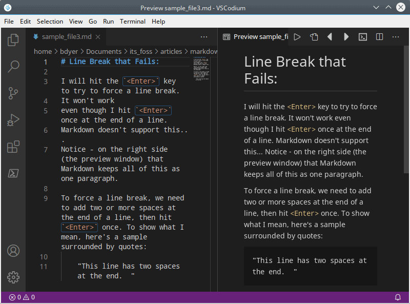 然而,有时你可能需要拆分段落或者换行。Markdown 确实有一种方法可以做到,但是它一开始看起来可能有一点奇怪:换行是通过用两到多个空格键然后点一次回车键完成的。