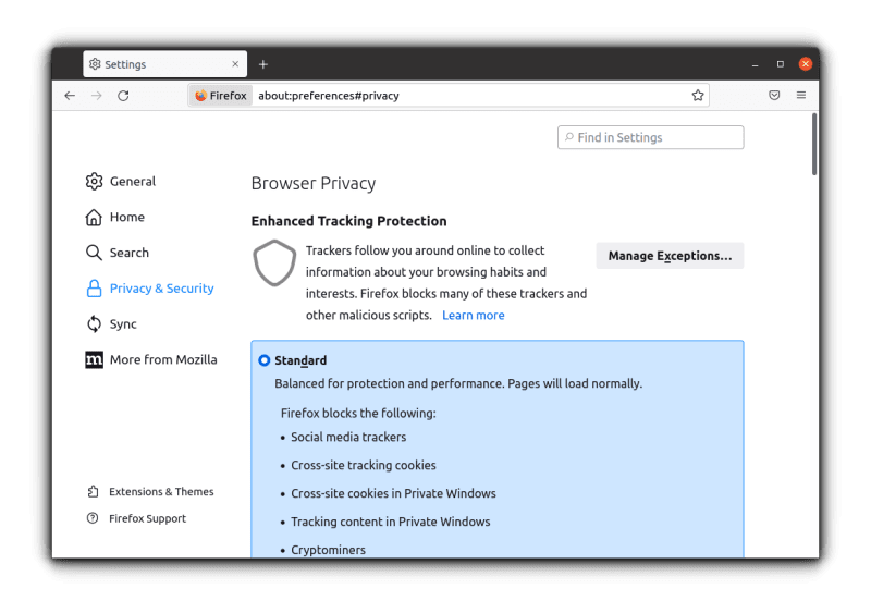Firefox 使用启用的基本保护来摆脱常见的追踪器,而不会破坏网页的用户体验。
