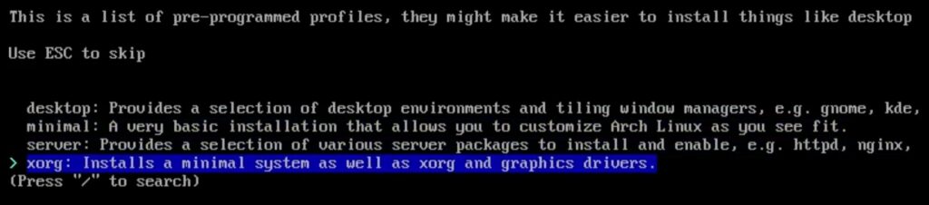 你只需要输入 archinstall,就可以开始一步步的安装,而不需要自己全部定制。