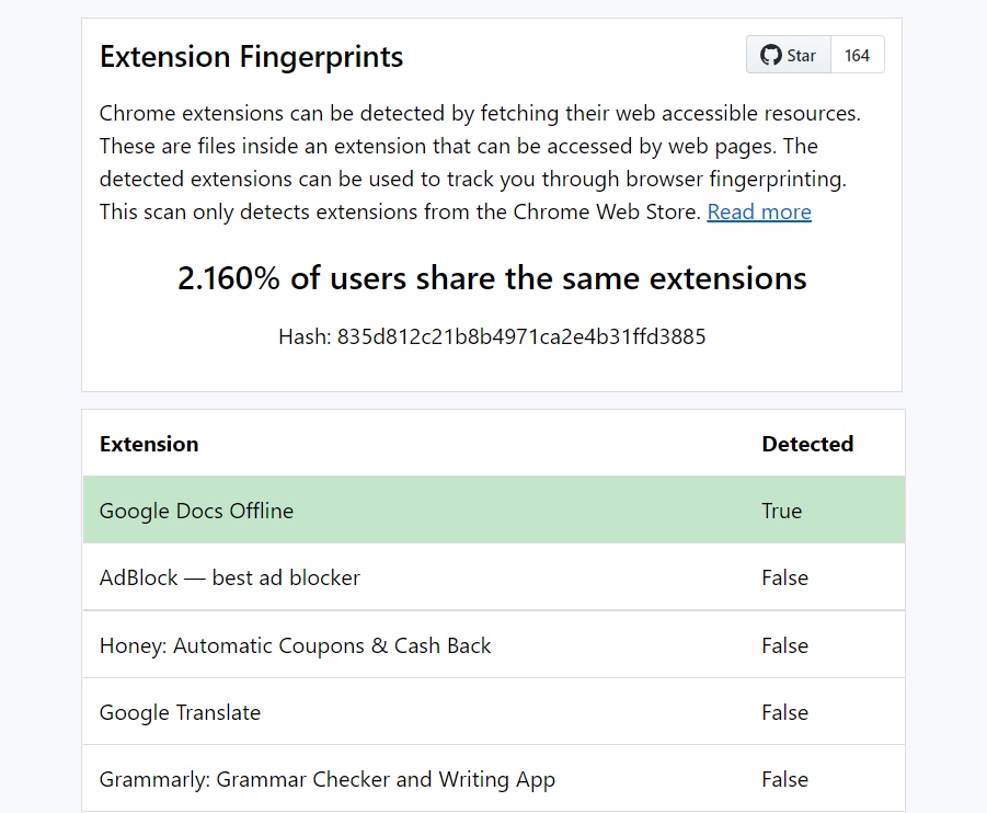 研究人员发布了一个开源项目 “Extension Fingerprints”,你可以使用它来测试你安装的 Chrome 扩展是否能被检测到。