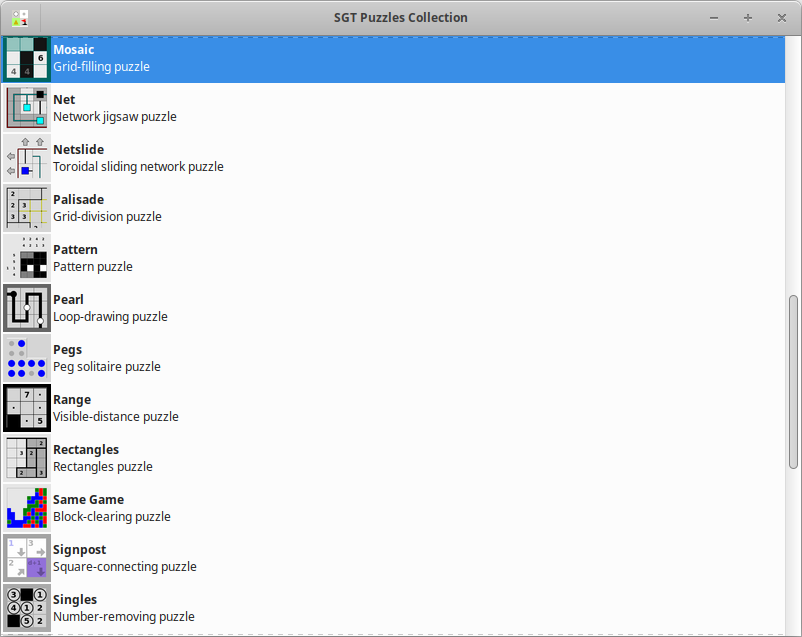 Alt-Tab视图通过更突出的图标进行了改进。- 马赛克拼图添加到 SGT 拼图系列。