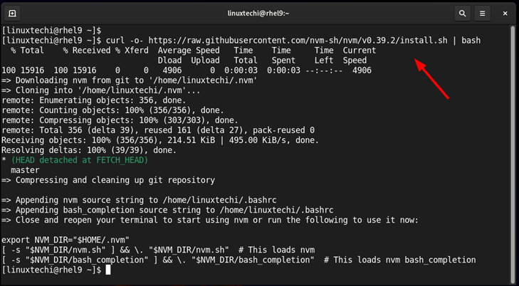 $ curl -o- https://raw.githubusercontent.com/nvm-sh/nvm/v0.39.2/install.sh | bash