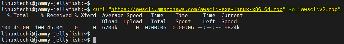 $ curl "https://awscli.amazonaws.com/awscli-exe-linux-x86_64.zip" -o "awscliv2.zip"