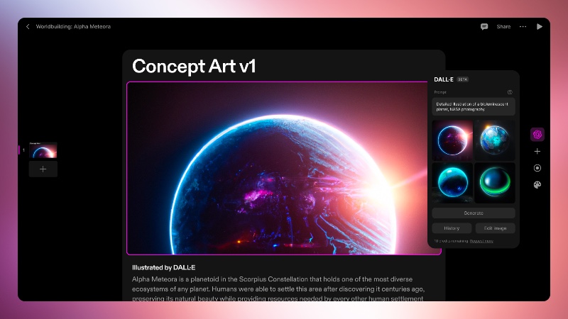 一家初创公司借助 DALL-E 的 API 创建生成性的幻灯片(PPT),其产品旨在让用户在几分钟内,而不是几小时内创建幻灯片。他们发现,对于他们的大多数用户来说,“在几次尝试中可以得到一些有助于实现其观点的东西。”并且,他们还计划利用 GPT-3 对文件进行总结,添加到幻灯片中。