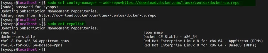 $ sudo dnf config-manager --add-repo=https://download.docker.com/linux/centos/docker-ce.repo