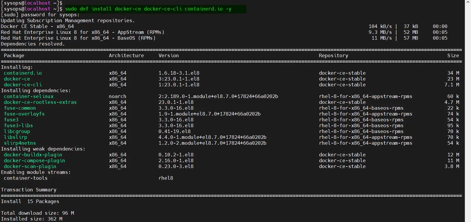 $ sudo dnf install docker-ce docker-ce-cli containerd.io -y
