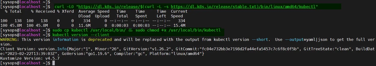 $ sudo cp kubectl /usr/local/bin/ && sudo chmod +x /usr/local/bin/kubectl