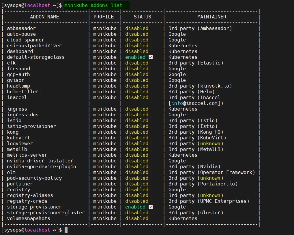 MiniKube 提供插件,可以为我们的集群添加额外的功能。要列出所有可用的插件,运行: