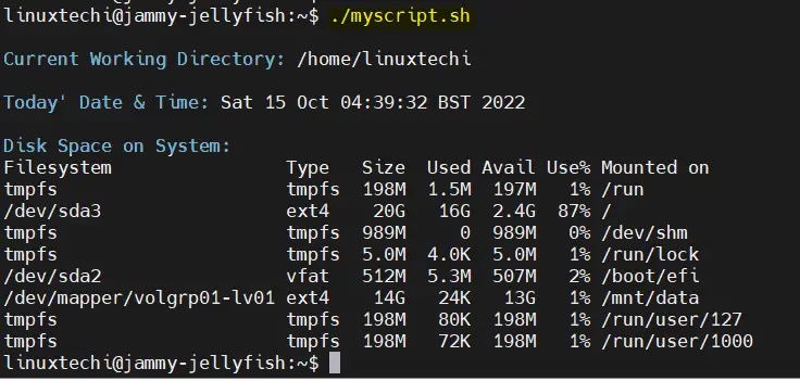 上方的脚本将会展示当前工作目录、今天的日期与时间,还有磁盘空间。我们需要用到 echo 命令 和其它 Linux 命令 来实现这个脚本。