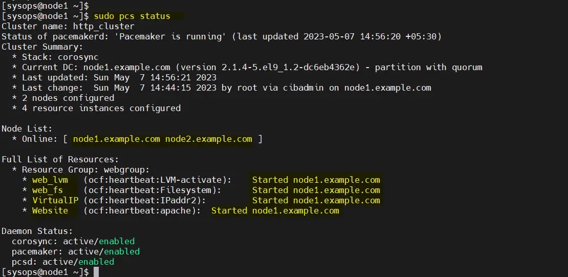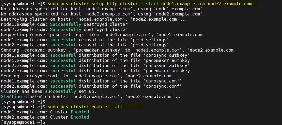 $ sudo pcs cluster setup http_cluster --start node1.example.com node2.example.com