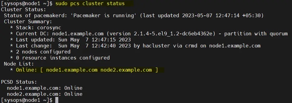 $ sudo pcs host auth node1.example.com node2.example.com