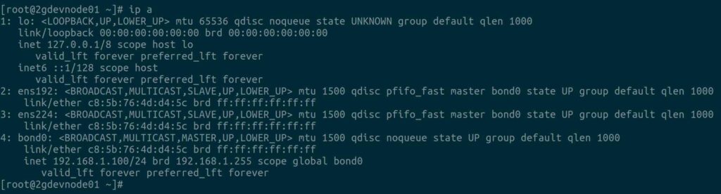你可以借助 ip 命令 来查看绑定接口以及其子接口的情况。可以看到,bond0 现在已启动并在运行。