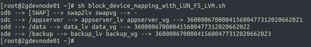 echo "$bdevice --> $mpoint --> $LVM_INFO --> $LUN_ID"