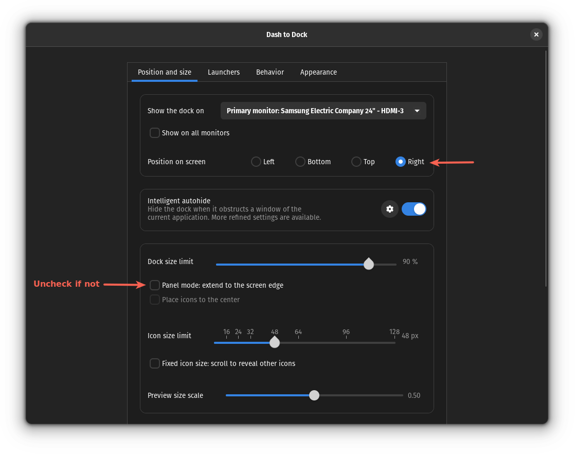 首先,在系统菜单中打开设置,然后进入 “ 外观 Appearance ” 菜单。在 “ 停靠区 Dock ” 部分,你会找到 “ 在屏幕上的位置 Position on screen ” 选项。