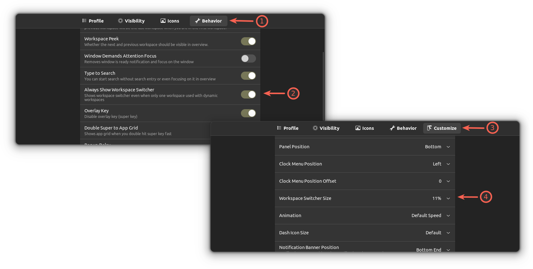 - 前往 “ 行为 Behavior ” 菜单并打开 “ 始终显示工作区切换器 Always Show Workspace Switcher ”